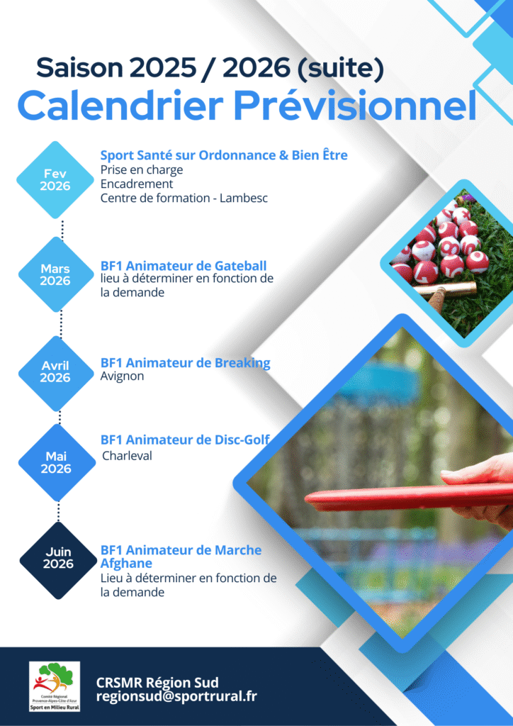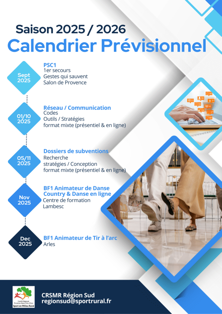 Le Comité Régional du Sport en Milieu Rural (CRSMR) vous présente son nouveau calendrier prévisionnel de formation pour l’année à venir. Conçu en concertation avec les acteurs du réseau, ce programme a pour objectif de renforcer les compétences des bénévoles, éducateurs et responsables associatifs qui animent la vie sportive dans nos territoires ruraux.